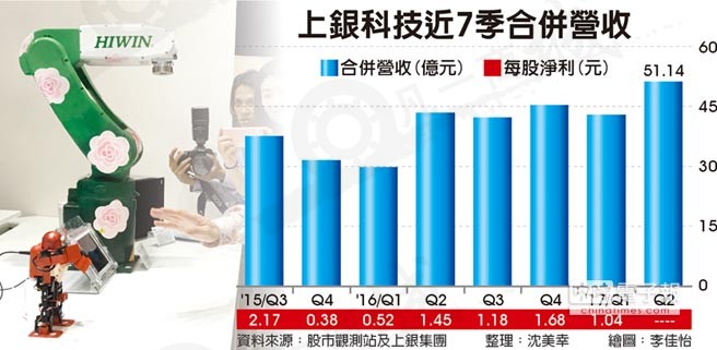 上銀三大主力商品滾珠絲桿、直線導軌及機器人,因全球力推工業(yè)4.0,對智慧自動化設備需求殷切,智慧自動化需要用到滾珠絲桿及直線導軌等關鍵零組件,加上全球景氣逐步回升,尤其今年大陸、歐洲及日本等地市場需求持續(xù)成長,帶旺6月合并營收攀升至17.71億元,年增加14.55%,續(xù)創(chuàng)單月營收新高;第2季合并營收51.14億元,年增18.15%,創(chuàng)單季營收高;上半年合并營收高達94.02億,也創(chuàng)同期新高,表現(xiàn)優(yōu)于市場預期。
