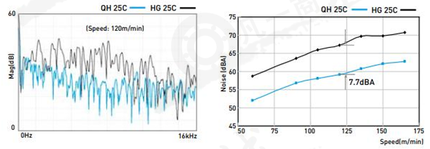 利用同步連接器可使滾珠均勻等間隔的排列,滾珠和滾逐漸的相互撞擊金屬聲消失,尖銳的高頻聲音強度有效降低(見下圖),總和的噪音強度與舊有系列比較在各個速度域有效降低約低7.7分貝。